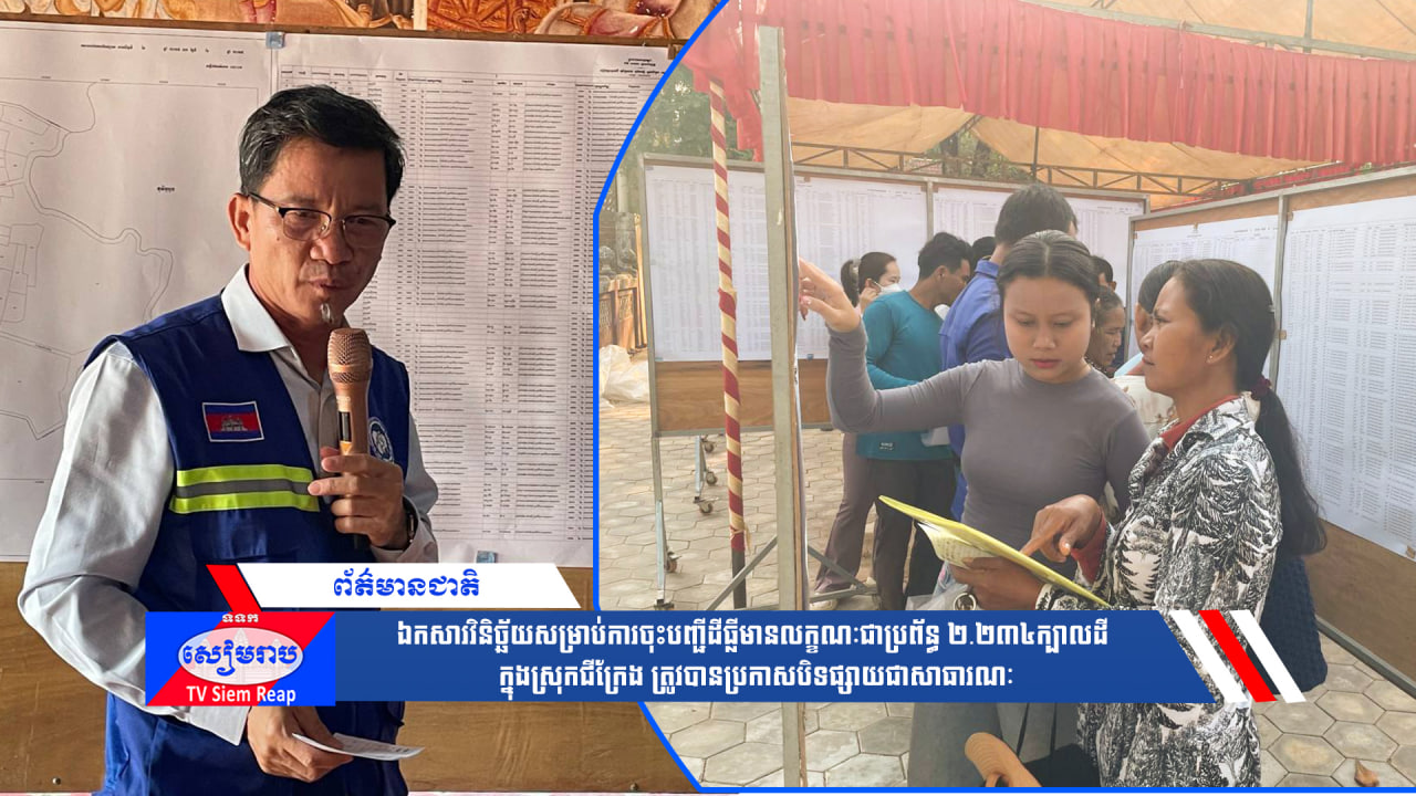 ឯកសារវិនិច្ឆ័យសម្រាប់ការចុះបញ្ជីដីធ្លីមានលក្ខណៈជាប្រព័ន្ធចំនួន ២.២៣៤ក្បាលដី ក្នុងឃុំកំពង់ក្ដី ស្រុកជីក្រែង ខេត្តសៀមរាប ត្រូវបានមន្ទីររៀបចំដែនដីខេត្ត សហការជាមួយរដ្ឋបាលស្រុក បិទផ្សាយជាសាធារណៈ ដើម្បីឱ្យប្រជាពលរដ្ឋ និងអ្នកកាន់កាប់ ឬម្ចាស់ក្បាលដី ធ្វើការពិនិត្យផ្ទៀងផ្ទាត់មុននឹងឈានដល់ការទទួលបានបណ្ណកម្មសិទ្ធិសម្គាល់ម្ចាស់អចលនទ្រព្យ ដែលពិធីនេះធ្វើឡើងក្នុងវត្តបុព្វទិសារាម ហៅវត្តកំពង់ក្ដី នៅព្រឹកថ្ងៃទី១៣ ខែកុម្ភៈ ឆ្នាំ២០២៥នេះ។