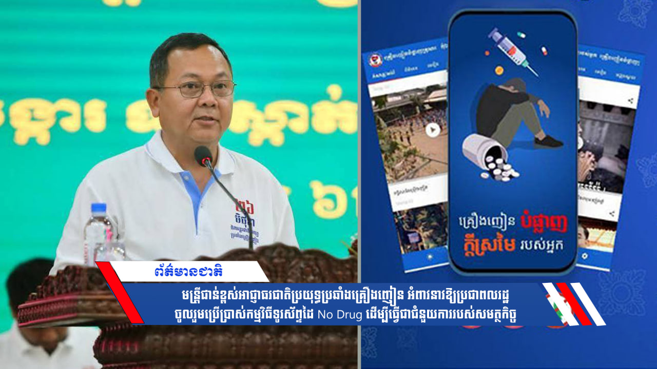មន្រ្តីជាន់ខ្ពស់អាជ្ញាធរជាតិប្រយុទ្ធប្រឆាំងគ្រឿងញៀន បានអំពាវនាវដល់ប្រជាពលរដ្ឋ ជាពិសេសយុវជន ចូលរួមប្រើប្រាស់កម្មវិធីទូរស័ព្ទដៃ No Drug ដើម្បីធ្វើជាផ្នែកមួយជួយដល់សមត្ថកិច្ច ក្នុងការរាយការណ៍ ដើម្បីចូលរួមលុបបំបាត់បញ្ហាគ្រឿងញៀនចេញពីសហគមន៍របស់យើង បន្តស្មារតីរួបរួម និងចលនាជាតិមួយ អនុវត្តខ្លឹមសារ “រួមគ្នាបង្ការ ទប់ស្កាត់ និងកាត់ផ្តាច់ឫសគល់នៃបញ្ហាគ្រឿងញៀននៅកម្ពុជា”។
